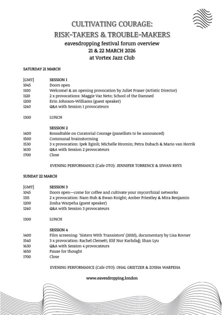 At the heart of the festival is the forum, a two-day gathering at Vortex Jazz Club for local and visiting artists alike to reflect together on a given topic. Our 2026 festival forum will explore CULTIVATING COURAGE: TROUBLE-MAKERS & RISK-TAKERS. Weighty talks given by guest speakers Erin Johnson-Williams and Zosha Warpeha sit alongside shorter provocations gathered through our annual open call. (See forum overview below.) The vibe is low-key and friendly, whilst definitely being thought-provoking.