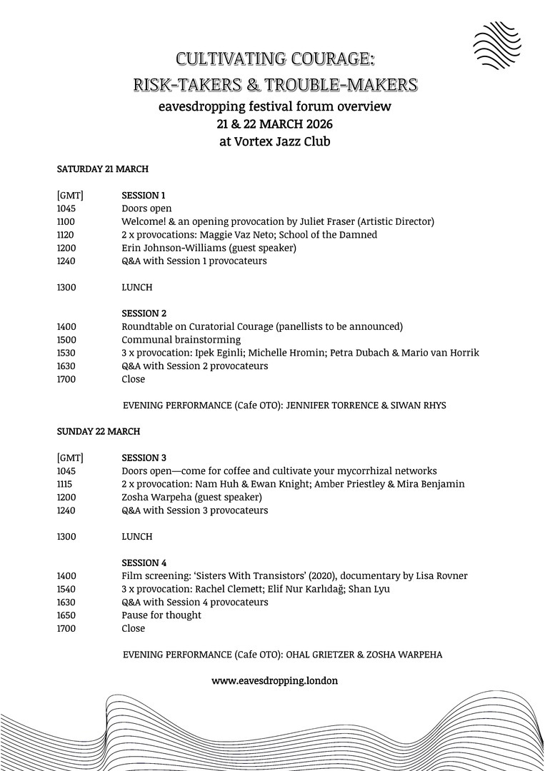 Our next festival is once again held at Cafe OTO and Vortex Jazz Club. Over the course of four evenings, eight performers present their latest works or works-in-progress in the intimate and informal setting of Cafe OTO. The programming within each set is artist-led: repertoire is only announced on the night, giving the performers the control and the flexibility to present whatever serves them best and giving the public special insight into the performer's freshest work. We aim to stimulate your ears and your imagination by presenting a surprising collection of artists working at the experimental fringes or intersections of various musical genres. In the lead up to the festival, you can find out more about our featured artists here or by listening to our podcast (on SoundCloud or search for 'eavesdropping conversations' wherever you find your podcasts).